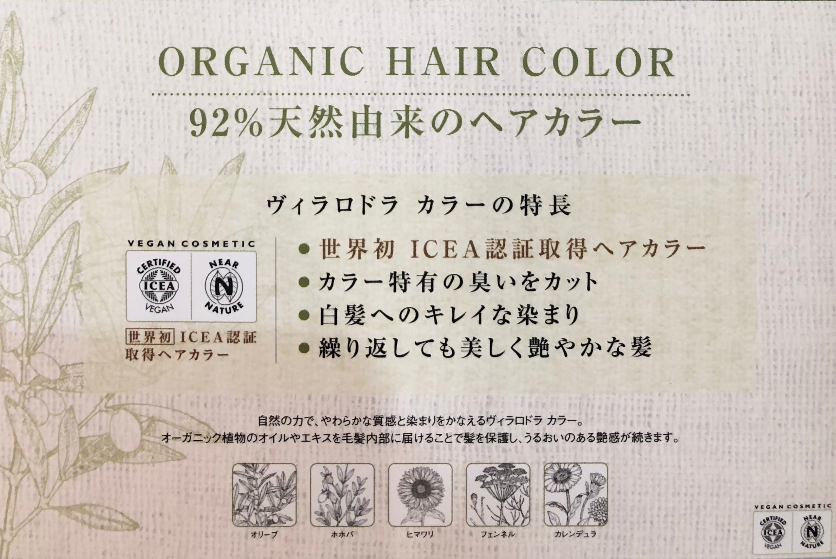 当店で扱っているオーガニックカラーは【ヴィラロドラ】という商材で、元々はイタリアのブランドで、日本のミルボンという美容メーカーが販売しています。